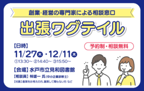 2025.11.1 土 【11/11(火)受付開始】令和7年度「第22期 みと創業支援塾」受講生募集 2025.10.24 金 【創業相談窓口】出張ワグテイル2025 2025.10.10 金 【相談窓口】「創業・経営無料相談 11月・12月 開催日」のご案内 2025.10.1 水 【セミナー】11/1(土)~12/28(日)「伴走型創業スクール2025(オンライン)」 開催予定日:2025年12月11日 【会場:見和図書館】創業相談窓口「出張ワ... 開催予定日:2025年11月28日 【受付中】創業フォローアップセミナー(オ... 開催予定日:2025年11月27日 【会場:見和図書館】創業相談窓口「出張ワ... 開催予定日:2025年11月01日 【受付終了】伴走型 創業スクール2025... 2021.3.17 水 起業者紹介Vol.1/畑岡久美子さん(笠間茶屋) 2025.11.15 土 【個別相談会】出張ワグテイル 2025.11.12 水 「月刊ワグテイル11月号」 HP掲載&配布中! 2025.11.8 土 \まもなく申込受付開始/みと創業支援塾 読み込み中... Tweets by Wagtail_Mito 茨城県水戸市南町3-3-35(栗原ビル1F) TEL 029-297-2770 FAX 029-297-2771 9:30 - 19:00 定休日 第1・3月曜、毎週火曜、祝日、年末年始 ※管理運営(一財)水戸市商業・駐車場公社