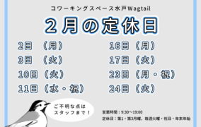 2026.1.16 金 【セミナー】2/18(水)「第60回 創業計画勉強会」 2026.1.16 金 【相談窓口】「創業・経営無料相談 2月 開催日」のご案内 2026.1.15 木 【セミナー】2/7(土)「頭脳交流会 in ワグテイル2026」 2026.1.7 水 【注意喚起】当公社の名前を詐称したメールについて 開催予定日:2026年02月18日 【受付中】第60回 創業計画勉強会 開催予定日:2026年02月07日 【受付中】頭脳交流会inワグテイル 開催予定日:2025年11月28日 【終了】創業フォローアップセミナー(オン... 開催予定日:2025年11月01日 【終了】伴走型 創業スクール2025(オ... 2021.3.17 水 起業者紹介Vol.1/畑岡久美子さん(笠間茶屋) 2026.1.31 土 【2月の定休日のお知らせ】 2026.1.28 水 \申込受付中!「創業計画勉強会(オンライン)」/ 2026.1.23 金 \参加者募集/「地方で起業するとは?-万博-」開催! 読み込み中... Tweets by Wagtail_Mito 茨城県水戸市南町3-3-35(栗原ビル1F) TEL 029-297-2770 FAX 029-297-2771 9:30 - 19:00 定休日 第1・3月曜、毎週火曜、祝日、年末年始 ※管理運営(一財)水戸市商業・駐車場公社