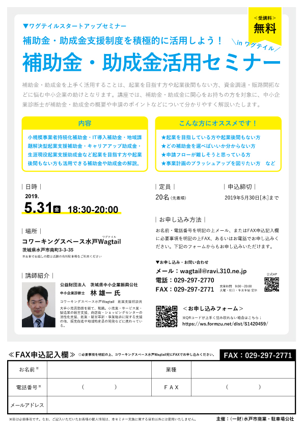 【終了】「補助金・助成金 活用セミナー in ワグテイル」