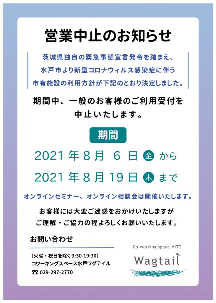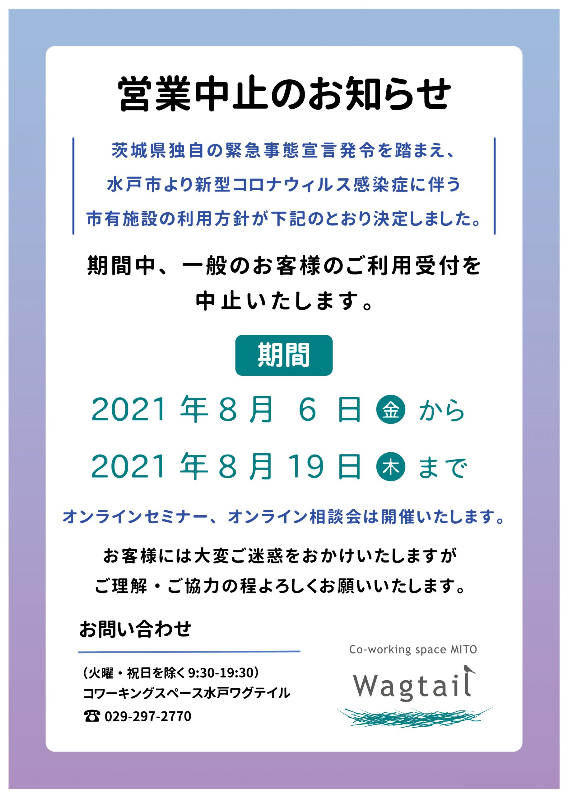 平素、コワーキングスペース水戸ワグテイルをご利用頂きありがとうございます。