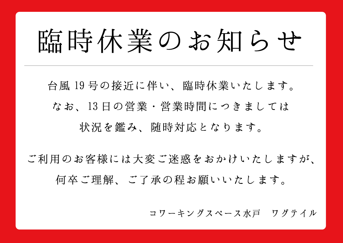 台風19号の接近に伴い、臨時休業いたします。