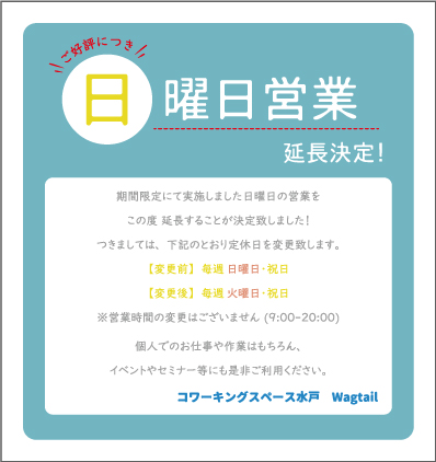 コワーキングスペース水戸Wagtailは、2018年4月より