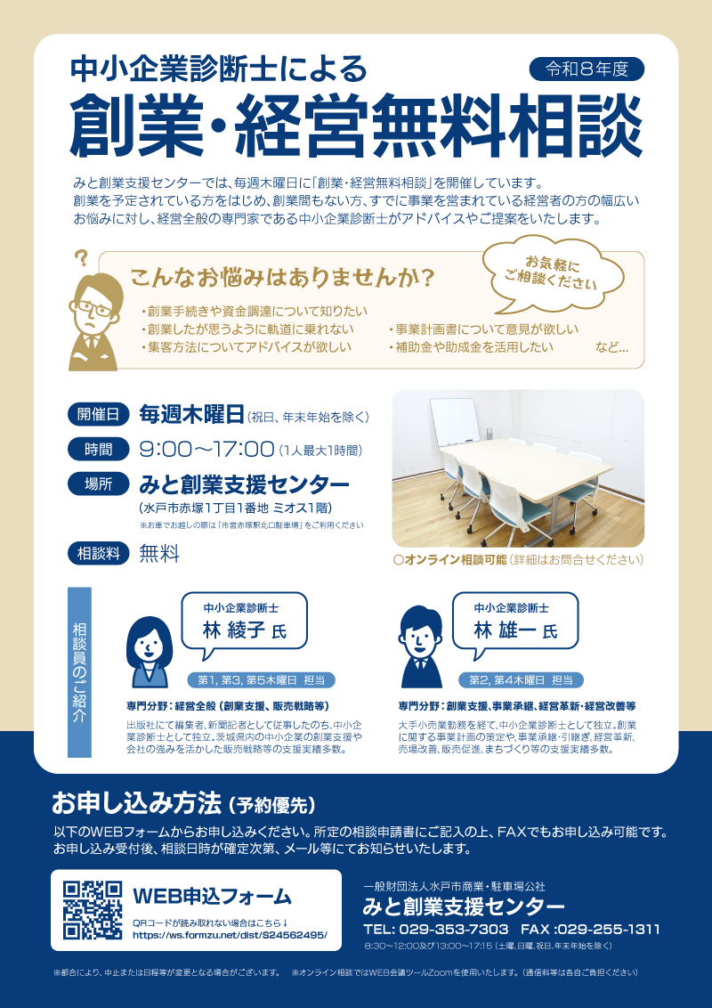 コワーキングスペース水戸ワグテイルの閉館に伴い、令和8年3月より「創業・経営無料相談」の場所及び時間が変更となりました。