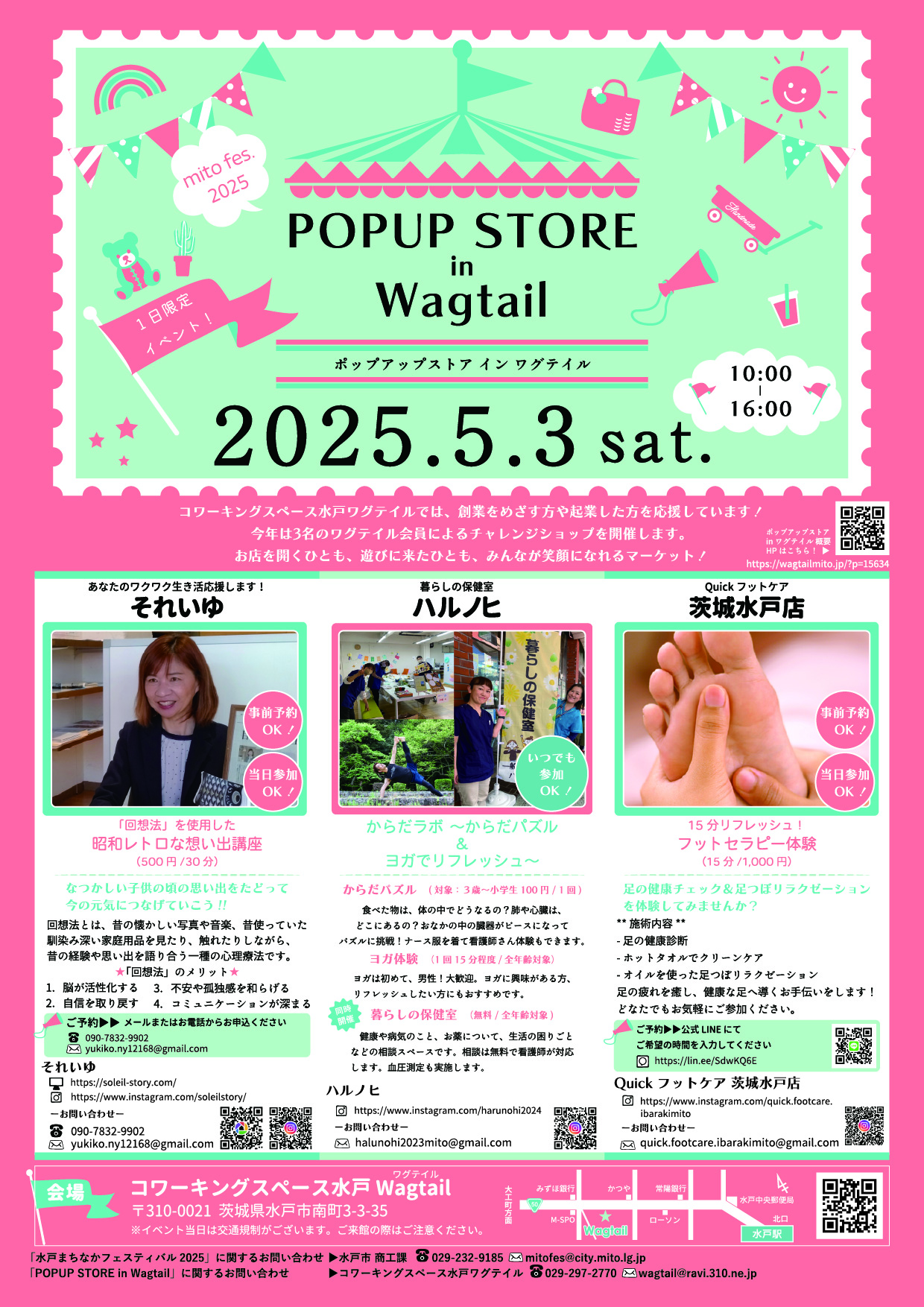 「ポップアップストアinワグテイル」に関するお問い合わせは、コワーキングスペース水戸ワグテイルまで。