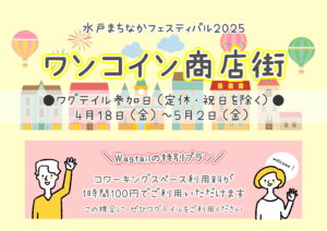 NEWSニュースアーカイブス 【お知らせ】GW期間中の営業日のご案内 2025.04.30 【イベント】ポップアップストア in ワグテイル(水戸まちなかフェスティバル2025) 2025.04.28 【イベント】ワンコイン商店街(水戸まちなかフェスティバル) 2025.04.26 【重要】営業時間・定休日変更のお知らせ 2025.04.01 茨城県水戸市南町3-3-35(栗原ビル1F) TEL 029-297-2770 FAX 029-297-2771 9:30 - 19:00 定休日 第1・3月曜、毎週火曜、祝日、年末年始 ※管理運営(一財)水戸市商業・駐車場公社