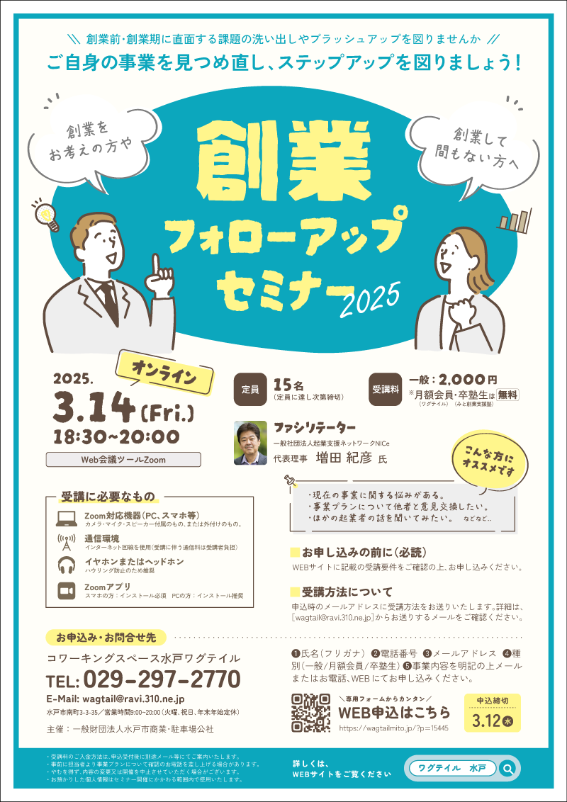みと創業支援塾卒塾生、コワーキングスペース水戸Wagtail月額会員:無料