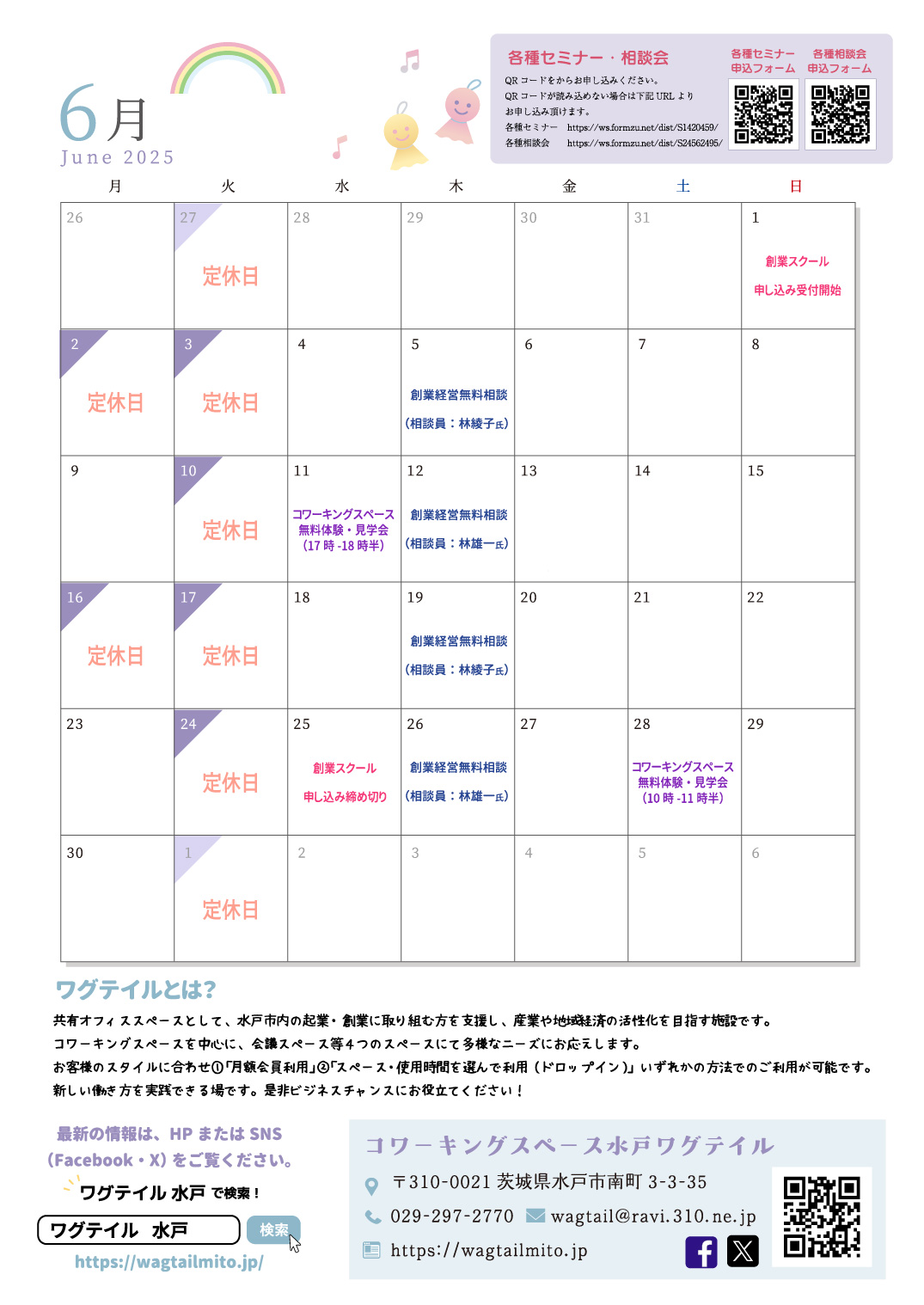 6月のスケジュールをまとめたチラシ、「月刊ワグテイル5月号」のお知らせです。