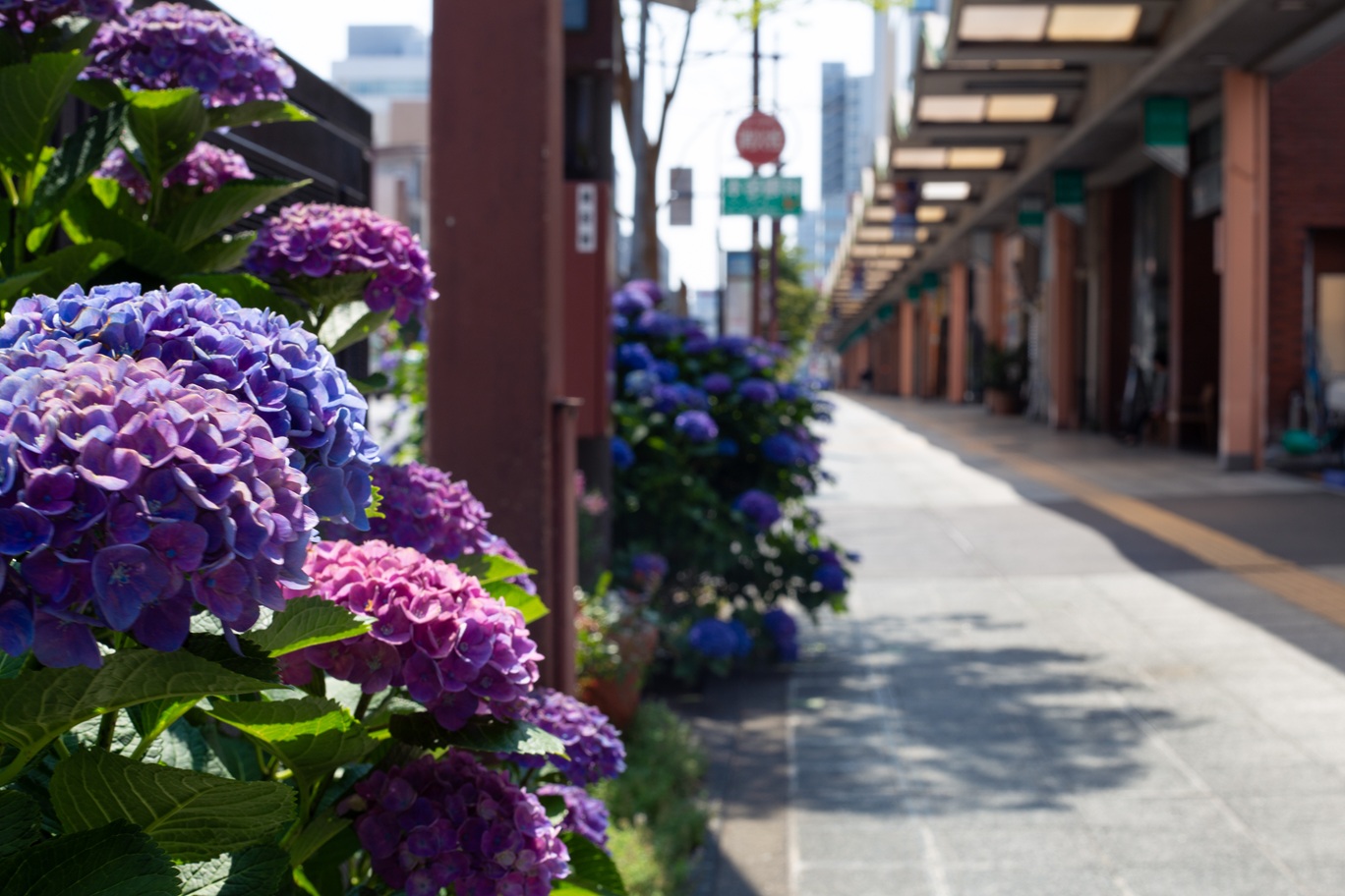 ワグテイル前の歩道も、毎年たくさんのあじさいが咲いています。