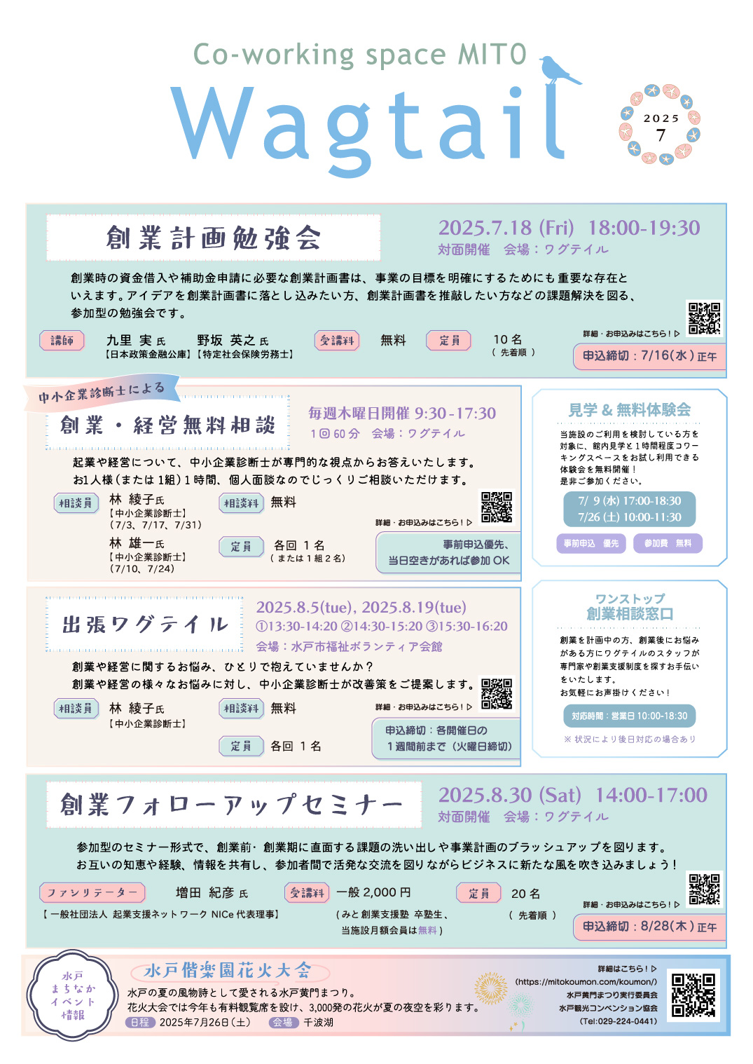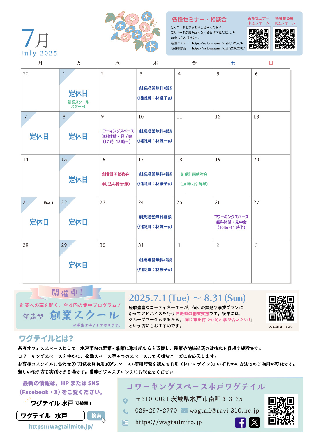 7月のスケジュールをまとめたチラシ、「月刊ワグテイル7月号」のお知らせです。