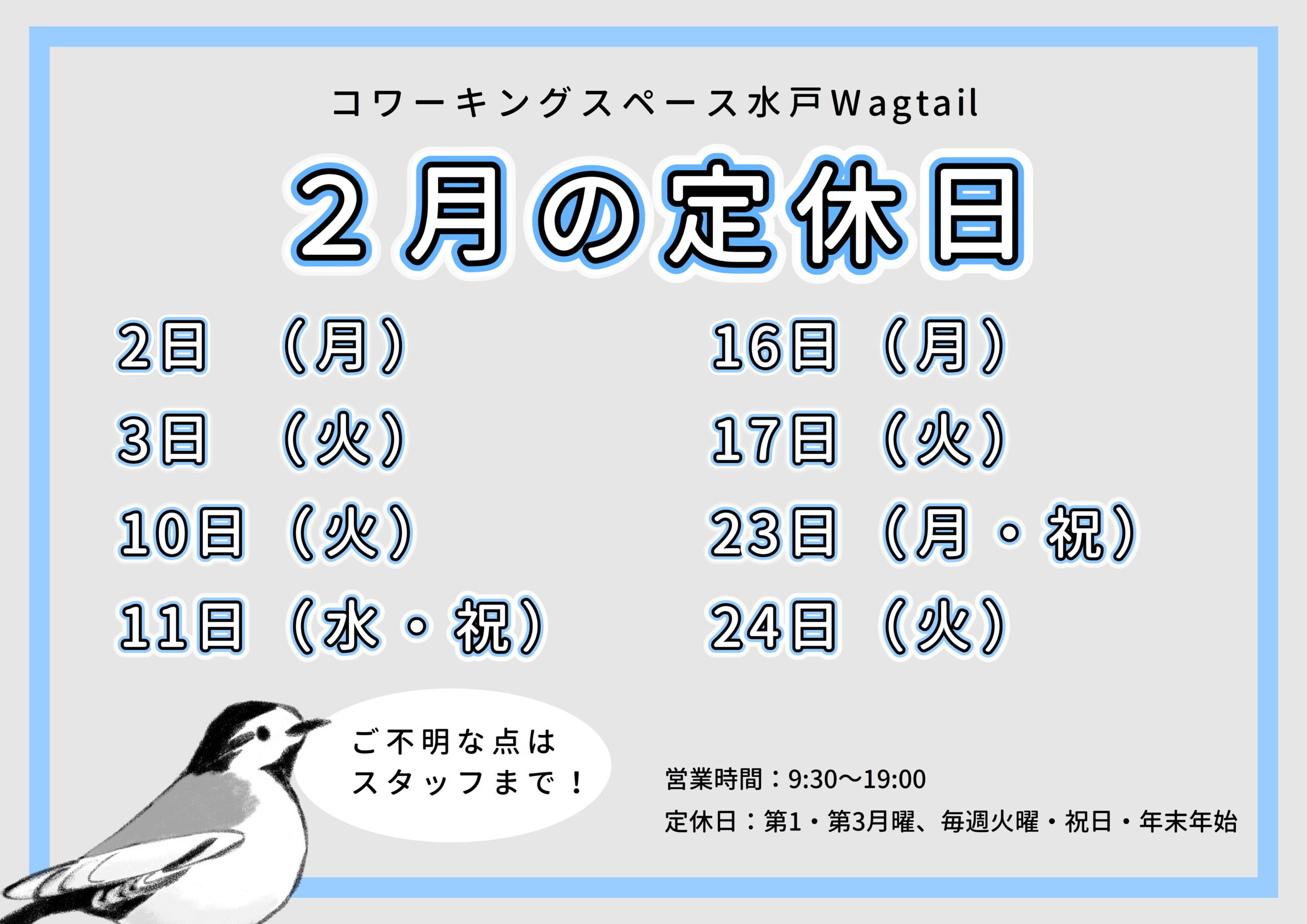 ブログ 2026Jan31 【2月の定休日のお知らせ】 2日(月) 3日(火) 10日(火) 11日(水・祝) 16日(月) 17日(火) 23日(月・祝) 24日(火) 毎週火曜日・祝日に加え、第1・第3月曜が定休日となります。 営業時間:9:30~19:00 住所:水戸市南町3-3-35 https://wagtailmito.jp Tweet « \申込受付中!「創業計画勉強会(オンライン)」/ 【2月の定休日のお知らせ】 2026年1月31日 土曜日 \申込受付中!「創業計画勉強会(オンライン)」/ 2026年1月28日 水曜日 \参加者募集/「地方で起業するとは?-万博-」開催! 2026年1月23日 金曜日 茨城県水戸市南町3-3-35(栗原ビル1F) TEL 029-297-2770 FAX 029-297-2771 9:30 - 19:00 定休日 第1・3月曜、毎週火曜、祝日、年末年始 ※管理運営(一財)水戸市商業・駐車場公社