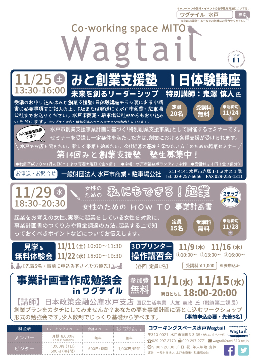 コワーキングスペース水戸Wagtailの11月の予定をお知らせいたします。