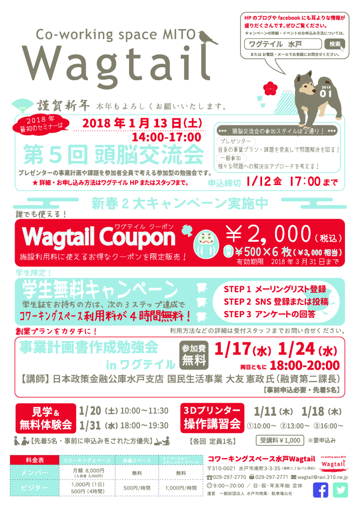 コワーキングスペース水戸Wagtailの1月の予定をお知らせいたします。