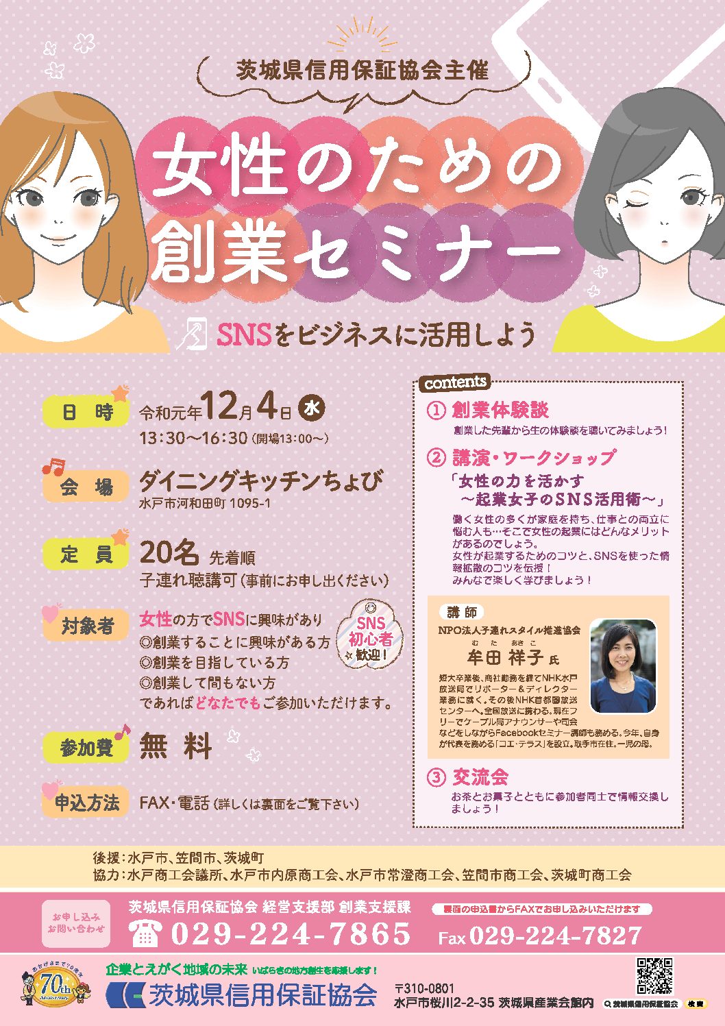 【茨城県信用保証協会様主催】「女性のための創業セミナー」のお知らせ