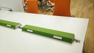 また、ロングデスク上には机上配線ユニットを設置していますので、