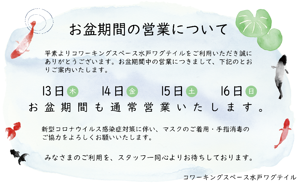 ワグテイルのお盆期間中の営業についてご案内いたします。