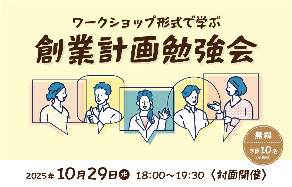 日本政策金融公庫水戸支店の融資ご担当者と、社会保険労務士の方を講師にお招きし、ワークショップ形式で学ぶ勉強会。創業準備中や創業後間もない方が抱える課題を、参加者と共有しながら少しずつクリアにしていきます。2019年9月の第1回から、これまでに6回開催しています。