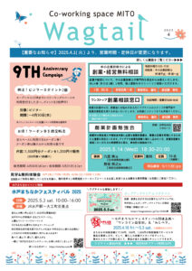 || pdf版はこちら(約1.5MB) || 2025年4月号 ■ワグテイルからのお知らせ 【営業時間・定休日変更のお知らせ】 コワーキングスペース水戸ワグテイルでは、令和7年4月1日より定休日及び営業時間が変更になりま […]
